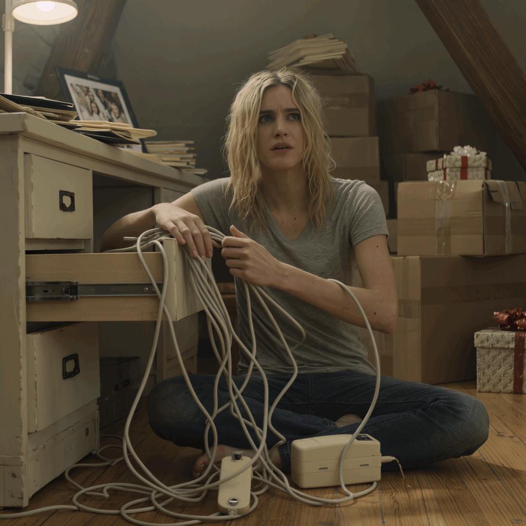 The attic was dustier than I remembered. The crime scene techs had taken their photos and measurements and left things mostly where they’d found them. The bottled water cases still leaned against the wall. The desk drawer still hung open, cables coiled inside.