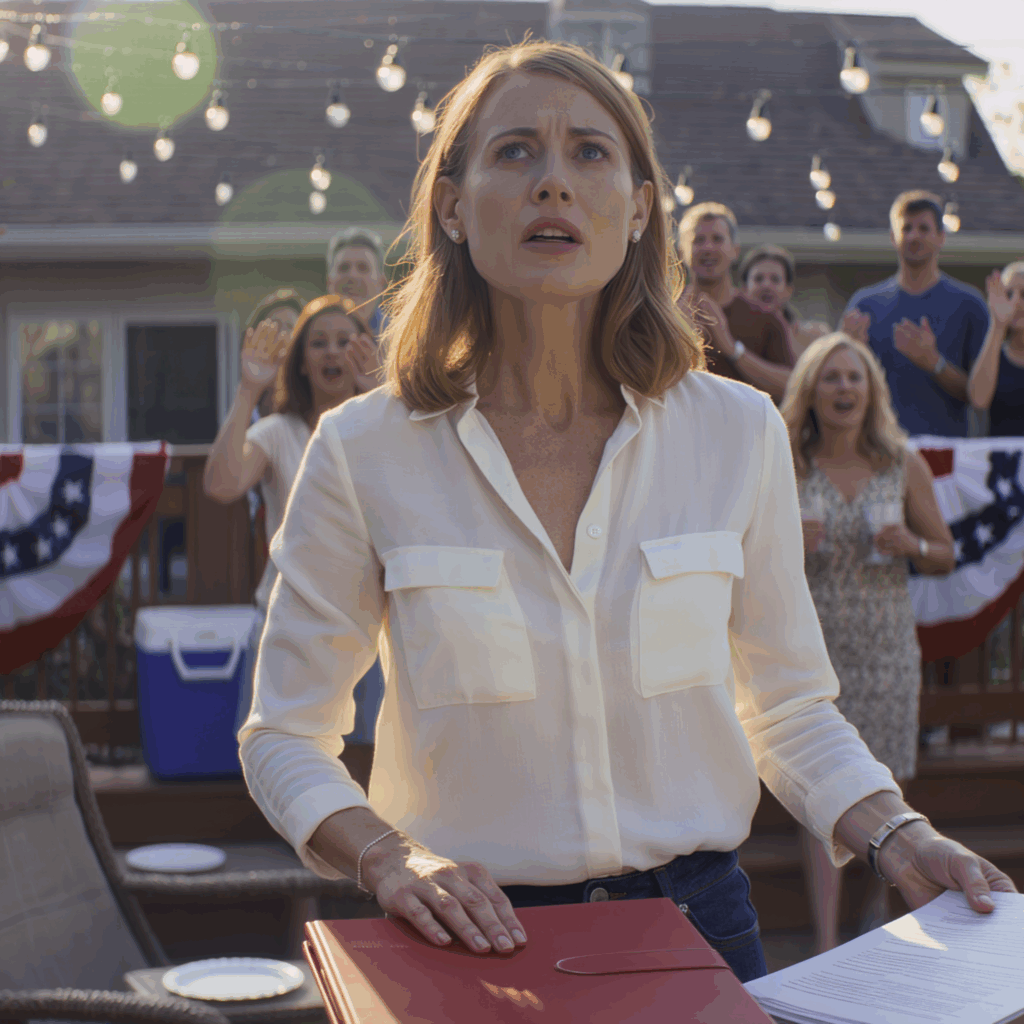 The speakers on the deck were crooning Sinatra under a strand of red, white, and blue bunting that sagged in the July heat. A tiny US‑flag magnet pinned the reunion program to the stainless fridge just inside the kitchen; plastic cups of iced tea sweated rings on the buffet beside a cooler the color of a Little League infield. I stood in the doorway with a canvas tote on my shoulder and a red‑stamped folder inside labeled, in block caps, PROOF OF LIFE. Fifty, maybe sixty people filled the backyard—church friends, cousins, business partners, the same orbit that used to define my weather. I stepped onto the boards. The music hiccuped and fell silent. Glass met wood, then shattered. I smiled the way you do when you’ve already done the math.