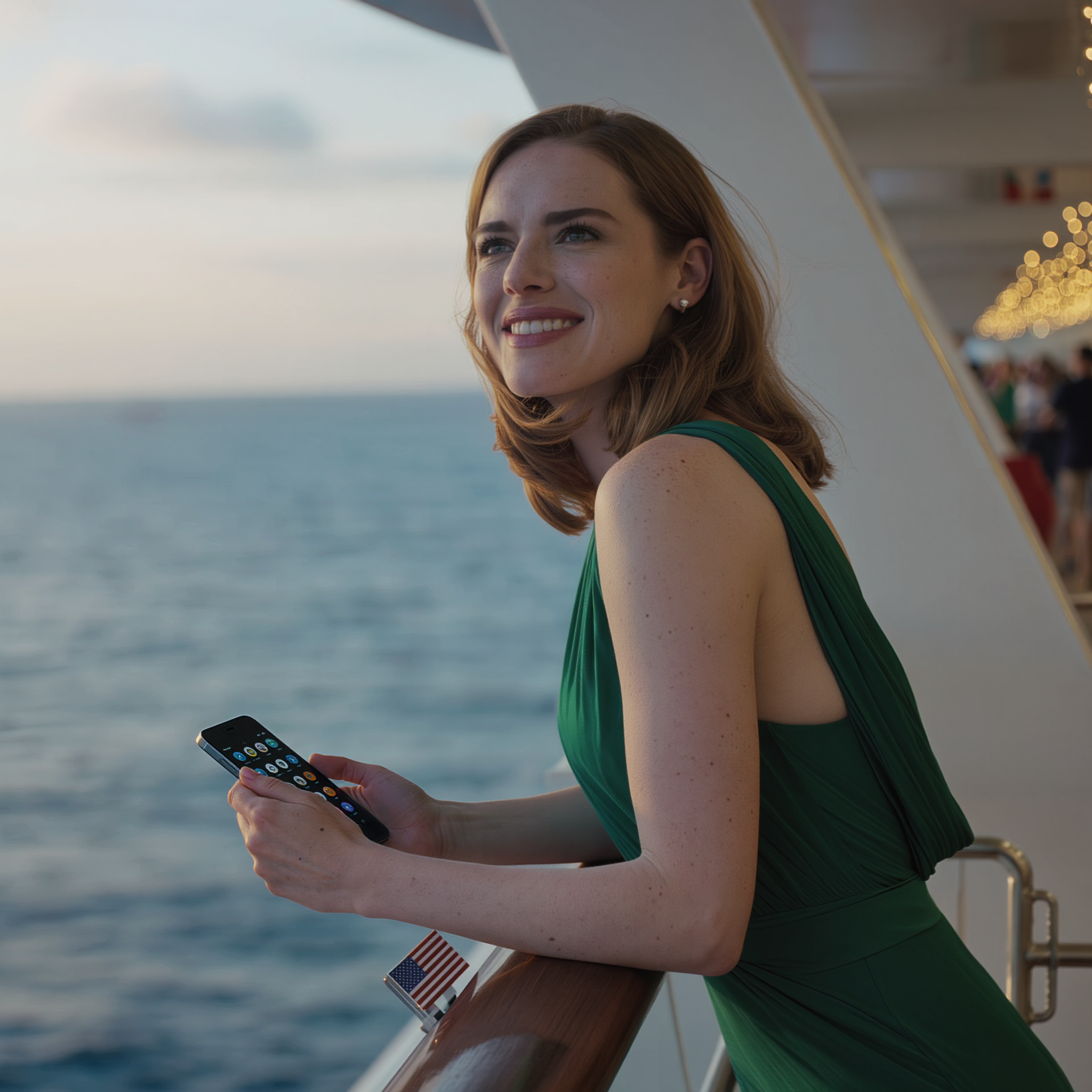 After dinner, I walked out onto the open deck. Strings of white lights crisscrossed overhead. The ship’s horn sounded, deep and resonant. The ocean wind was warm against my skin, lifting the hem of my green dress.