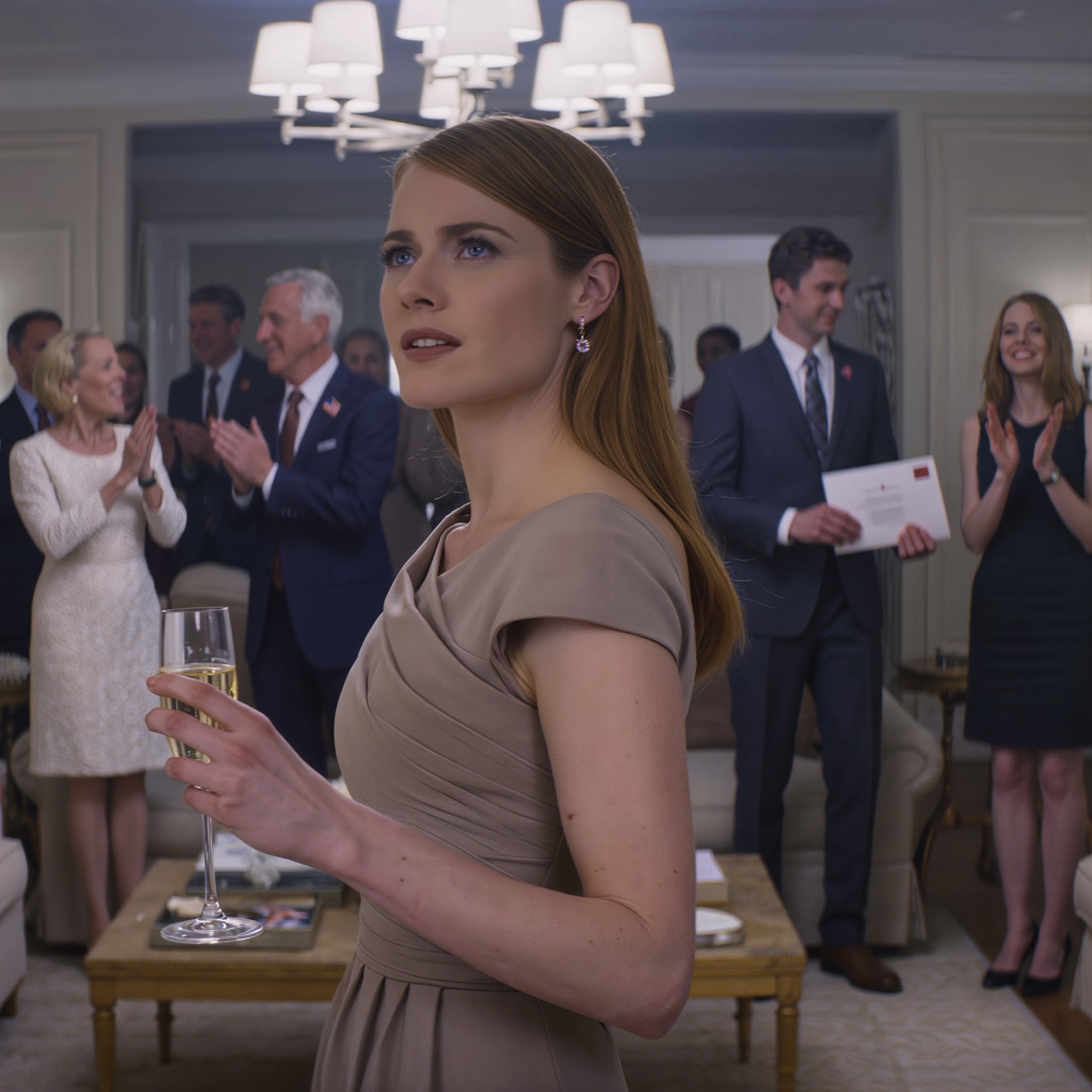 “Excuse me, everyone,” he said, raising his hand slightly. The music lowered, conversations trailed off. He stood in the center of the living room, my mother at his side, both wearing matching expressions of pride.
