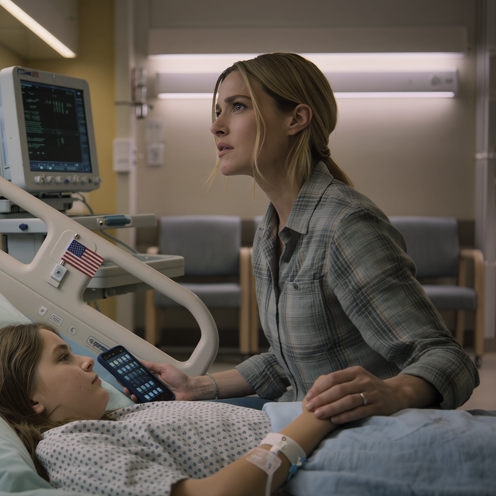 The monitors above my daughter’s hospital bed blinked in slow, bored colors, like a traffic light at 3 a.m. on a dead intersection. In my left hand, a paper coffee cup went lukewarm against my fingers, the kind with a tiny American flag printed near the logo, all red white and blue pretending this bitter liquid was comforting. In my right hand, my phone lit up again.