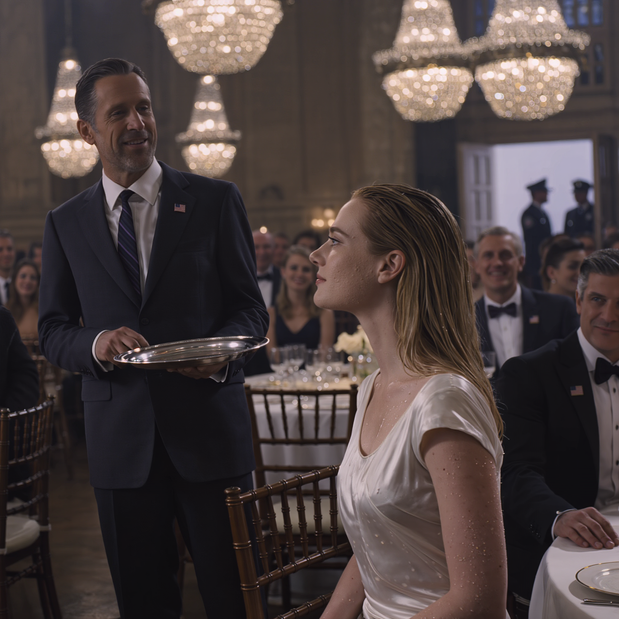 Champagne hit my shoulders, my chest, the silk of my white dress, sticky and freezing as it slid down my skin. I heard the gasp before I actually felt the wet; hundreds of people in gowns and tuxes turning toward table 19 at the back of the grand ballroom at the Art Institute of Chicago. Up on the little stage, behind my father, an American flag stood in the corner, the tiny gold eagle on top catching the chandelier light like it was enjoying the show. My father, David Larson, still holding the empty silver tray, stared down at me with a mock-helpless shrug, the wireless mic clipped to his lapel still live.